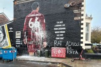 北京时间明天凌晨4点,欧冠第4轮利物浦将主场迎战皇马。赛前,前利物浦后卫阿诺德在利物浦当地的一处著名壁画遭到了球迷的污损。