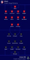 马德里竞技首发:3-鲁杰里、6-科克、7-格列兹曼、8-巴勃罗-巴里奥斯、10-巴埃纳、13-奥布拉克、16-莫利纳、17-汉茨科、19-胡利安-阿尔瓦雷斯、20-朱利亚诺-西蒙尼、24-勒诺尔芒