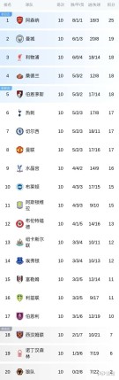 英超10轮过后,阿森纳6分优势领跑,曼城第二。利物浦、桑德兰和伯恩茅斯同积18分,分列3-5名。热刺、切尔西和曼联同积17分,分列6-8名。
